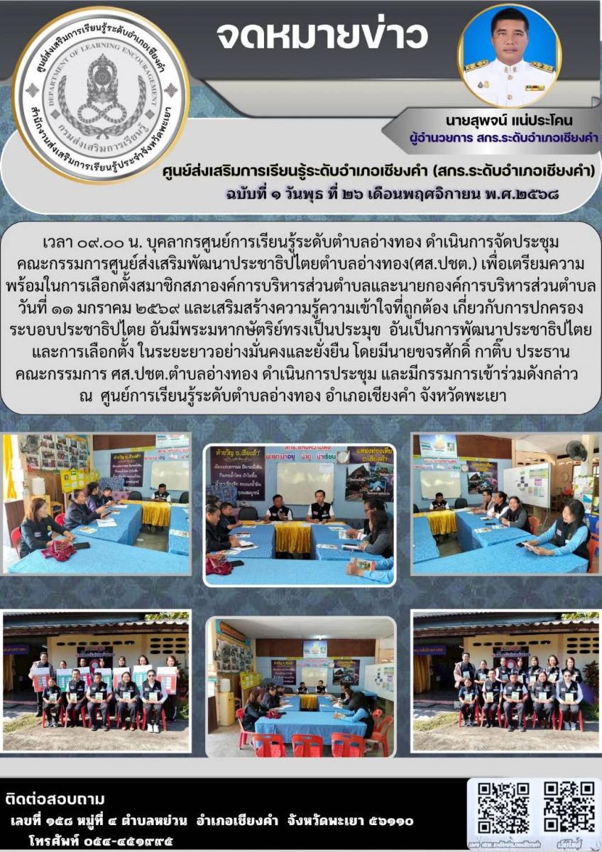 ดำเนินการจัดประชุมคณะกรรมการศูนย์ส่งเสริมพัฒนาประชาธิปไตยตำบลอ่างทอง(ศส.ปชต.)...