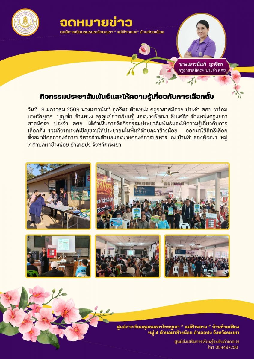จัดกิจกรรมประชาสัมพันธ์และให้ความรู้เกี่ยวกับการเลือกตั้ง รวมถึงรณรงค์เชิญชวนให้ประชาชนในพื้นที่ตำบลผาช้างน้อย...