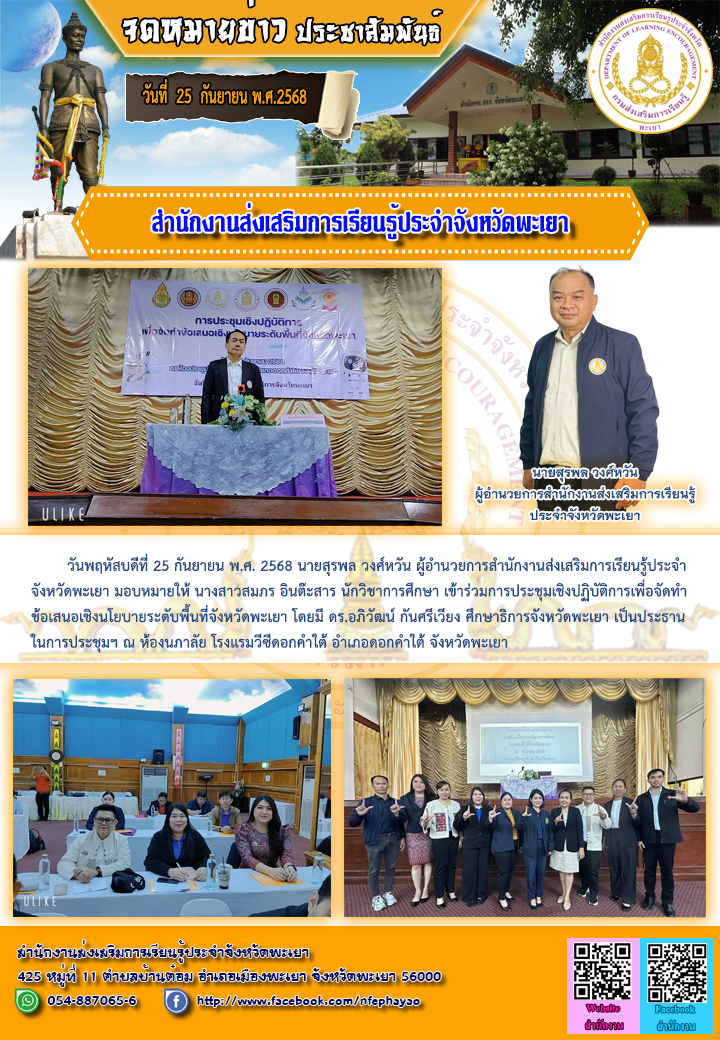 วันพฤหัสบดีที่ 25 กันยายน พ.ศ. 2568 นายสุรพล วงศ์หวัน ผู้อำนวยการสำนักงานส่งเสริมการเรียนรู้ประจำจังหวัดพะเยา มอบหมายให้ นางสาวสมภร อินต๊ะสาร นักวิชาการศึกษา เข้าร่วมการประชุมเชิงปฏิบัติการเพื่อจัดทำข้อเสนอเชิงนโยบายระดับพื้นที่จังหวัดพะเยา โดยมี ดร.อภิวัฒน์ กันศรีเวียง ศึกษาธิการจังหวัดพะเยา เป็นประธานในการประชุมฯ ณ ห้องนภาลัย โรงแรมวีซีดอกคำใต้ อำเภอดอกคำใต้ จังหวัดพะเยา