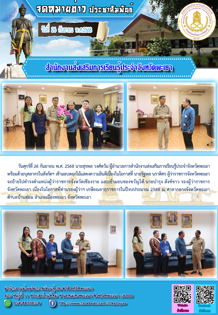 วันศุกร์ที่ 26 กันยายน พ.ศ. 2568 นายสุรพล วงศ์หวัน ผู้อำนวยการสำนักงานส่งเสริมการเรียนรู้ประจำจังหวัดพะเยา พร้อมด้วยบุคลากรในสังกัดฯ เข้ามอบดอกไม้แสดงความยินดีเนื่องในโอกาสที่ นายรัฐพล นราดิศร ผู้ว่าราชการจังหวัดพะเยา จะย้ายไปดำรงตำแหน่งผู้ว่าราชการจังหวัดเชียงราย และเข้ามอบของขวัญให้ นายบำรุง สังข์ขาว รองผู้ว่าราชการจังหวัดพะเยา เนื่องในโอกาสที่ท่านรองผู้ว่าฯ เกษียณอายุราชการในปีงบประมาณ 2568 ณ ศาลากลางจังหวัดพะเยา ตำบลบ้านต๋อม อำเภอเมืองพะเยา จังหวัดพะเยา