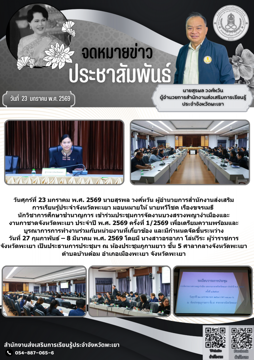 วันศุกร์ที่ 23 มกราคม พ.ศ. 2569 นายสุรพล วงศ์หวัน ผู้อำนวยการสำนักงานส่งเสริมการเรียนรู้ประจำจังหวัดพะเยา มอบหมายให้ นายทวีโชค เรืองขจรเมธี นักวิชาการศึกษาชำนาญการ เข้าร่วมประชุมการจัดงานบวงสรวงพญางำเมืองและงานกาชาดจังหวัดพะเยา ประจำปี พ.ศ. 2569 ครั้งที่ 1/2569 เพื่อเตรียมความพร้อมและบูรณาการการทำงานร่วมกับหน่วยงานที่เกี่ยวข้อง และมีกำหนดจัดขึ้นระหว่างวันที่ 27 กุมภาพันธ์ – 8 มีนาคม พ.ศ. 2569 โดยมี นางสาวอรอาภา โล่ห์วีระ ผู้ว่าราชการจังหวัดพะเยา เป็นประธานการประชุมฯ ณ ห้องประชุมภูกามยาว ชั้น 5 ศาลากลางจังหวัดพะเยา ตำบลบ้านต๋อม อำเภอเมืองพะเยา จังหวัดพะเยา