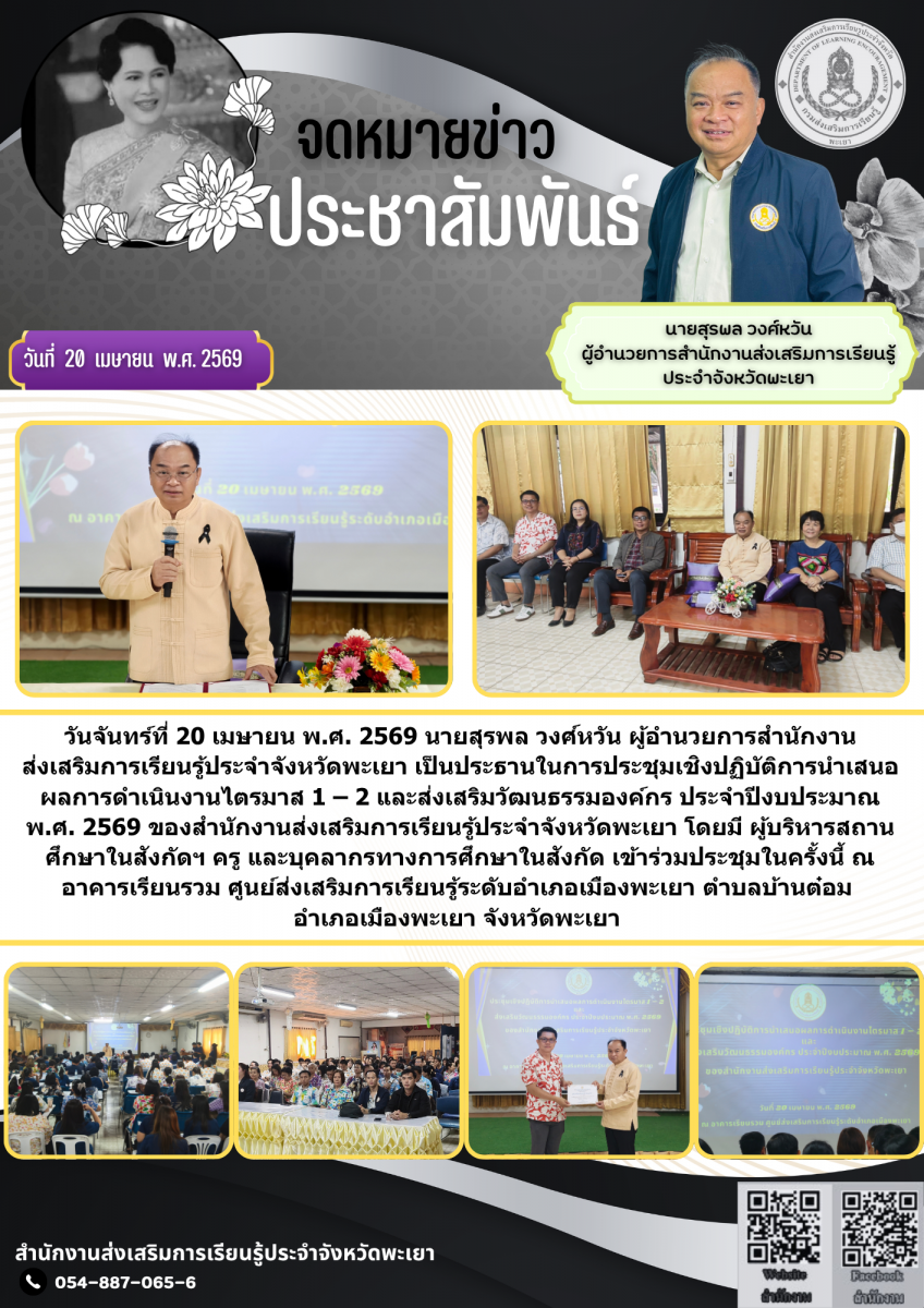 วันจันทร์ที่ 20 เมษายน พ.ศ. 2569 นายสุรพล วงศ์หวัน ผู้อำนวยการสำนักงานส่งเสริมการเรียนรู้ประจำจังหวัดพะเยา เป็นประธานในการประชุมเชิงปฏิบัติการนำเสนอผลการดําเนินงานไตรมาส 1 – 2 และส่งเสริมวัฒนธรรมองค์กร ประจำปีงบประมาณ พ.ศ. 2569 ของสำนักงานส่งเสริมการเรียนรู้ประจำจังหวัดพะเยา โดยมี ผู้บริหารสถานศึกษาในสังกัดฯ ครู และบุคลากรทางการศึกษาในสังกัด เข้าร่วมประชุมในครั้งนี้ ณ อาคารเรียนรวม ศูนย์ส่งเสริมการเรียนรู้ระดับอำเภอเมืองพะเยา ตำบลบ้านต๋อม อำเภอเมืองพะเยา จังหวัดพะเยา
