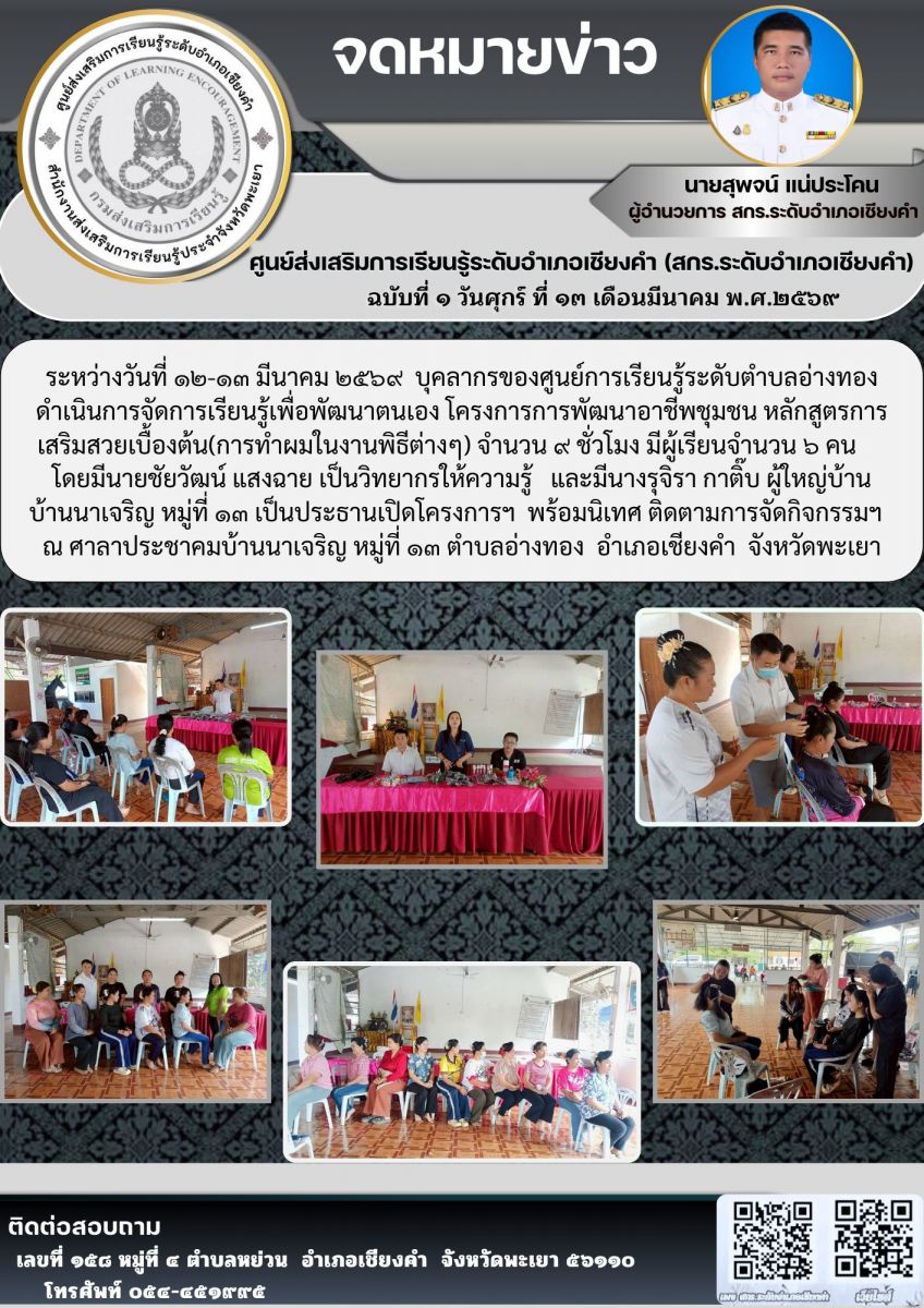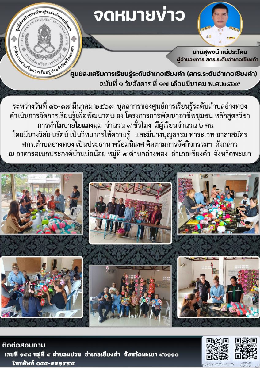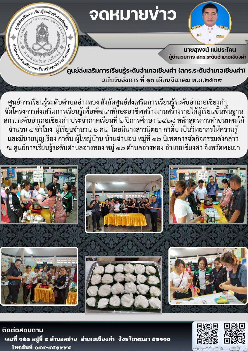 จัดโครงการส่งเสริมการเรียนรู้เพื่อพัฒนาทักษะอาชีพสร้างงานสร้างรายได้ผู้เรียนขั้นพื้นฐาน สกร.ระดับอำเภอเชียงคำ ประจำภาคเรียนที่ ๒ ปีการศึกษา ๒๕๖๘...