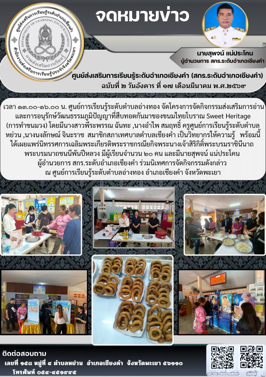 จัดโครงการจัดกิจกรรมส่งเสริมการอ่านและการอนุรักษ์วัฒนธรรมภูมิปัญญาที่สืบทอดกันมาของขนมไทยโบราณ Sweet Heritage (การทำขนมวง)...