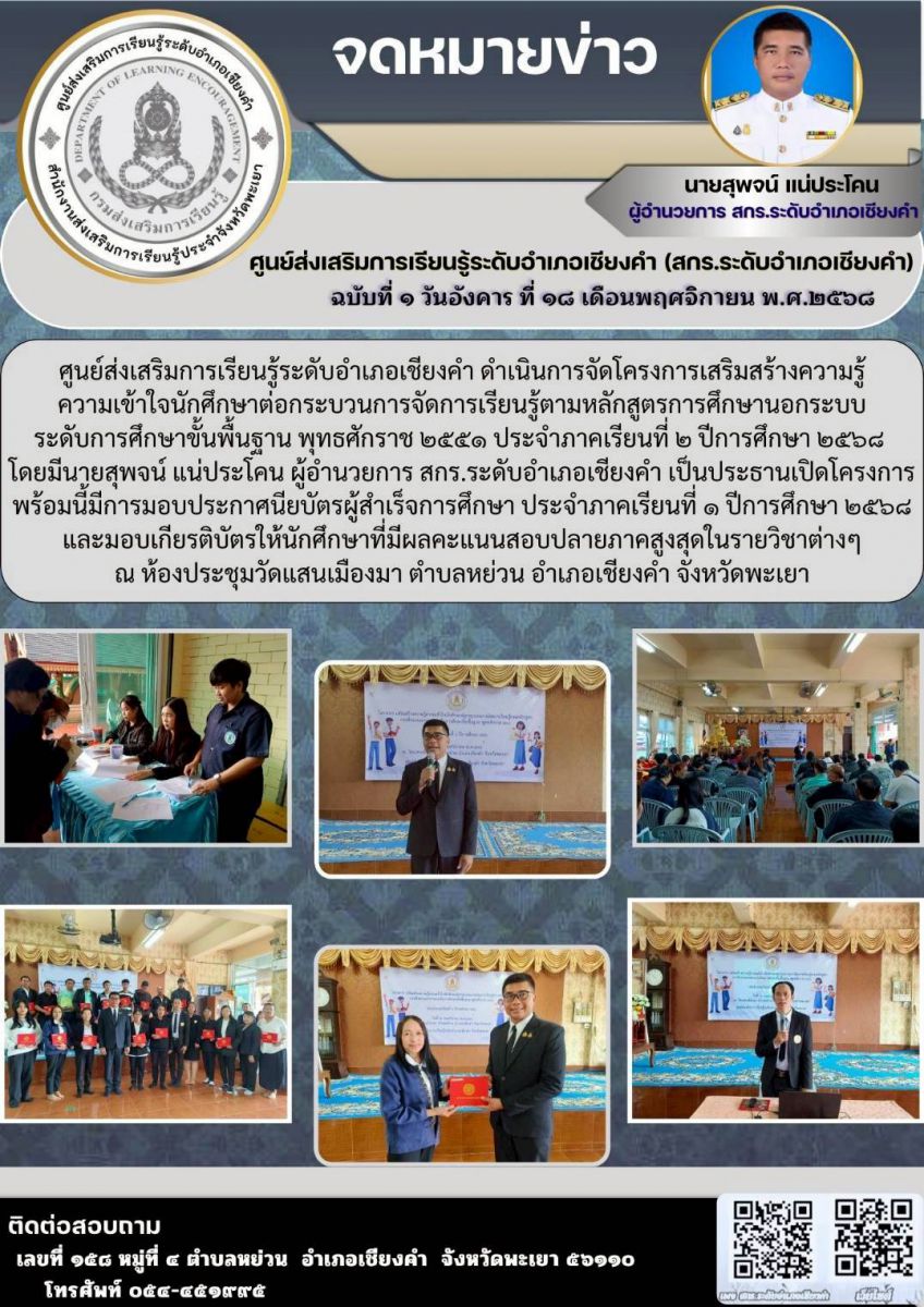 ศูนย์เรียนรู้ระดับตำบลทุ่งผาสุข ร่วมกับศูนย์ส่งเสริมการเรียนรู้ระดับอำเภอเชียงคำ ดำเนินการจัดโครงการเสริมสร้างความรู้ความเข้าใจนักศึกษาต่อกระบวนการจัด...