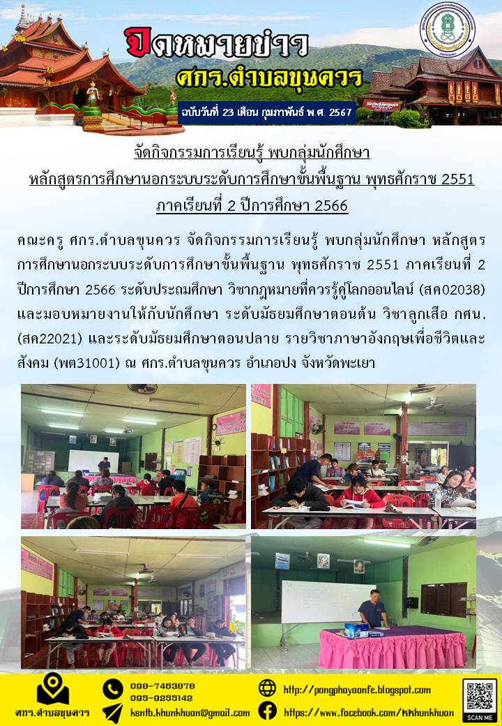 ร่วมเป็นคณะกรรมการคุมสอบการสอบวัดผลสัมฤทธิ์ปลายภาคเรียน หลักสูตรการศึกษานอกระบบระดับการศึกษาขั้นพื้นฐาน พุทธศักราช 2551 ภาคเรียนที่ 1 ปีการศึกษา 2567...