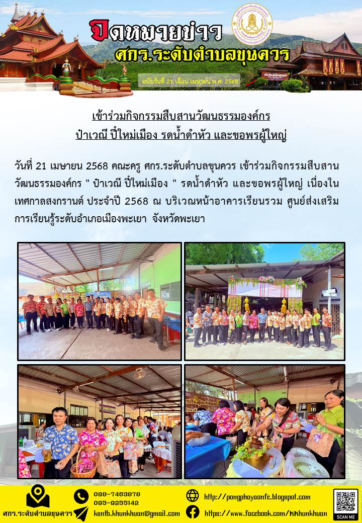 วันที่ 21 เมษายน 2568 คณะครู ศกร.ระดับตำบลขุนควร เข้าร่วมกิจกรรมสืบสานวัฒนธรรมองค์กร " ป๋าเวณี ปี๋ใหม่เมือง " รดน้ำดำหัว และขอพรผู้ใหญ่ เนื่องในเทศกาล...