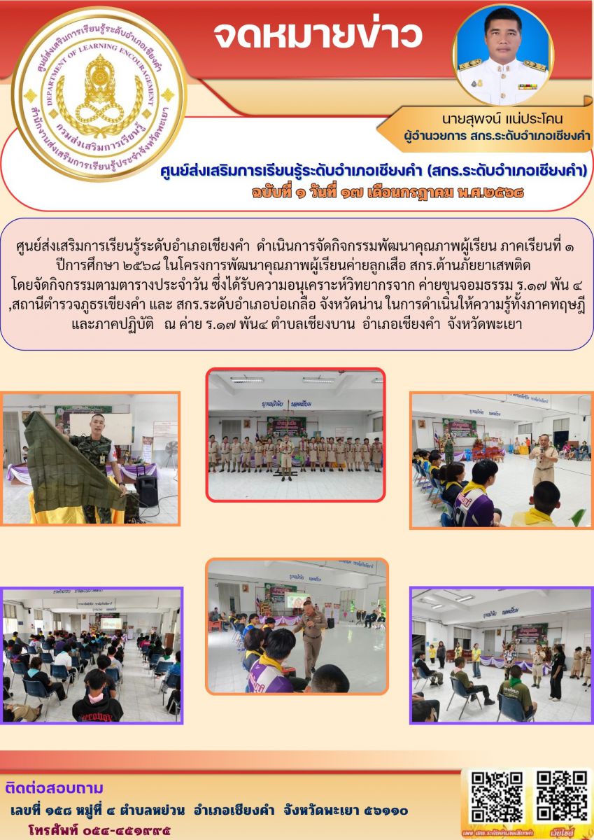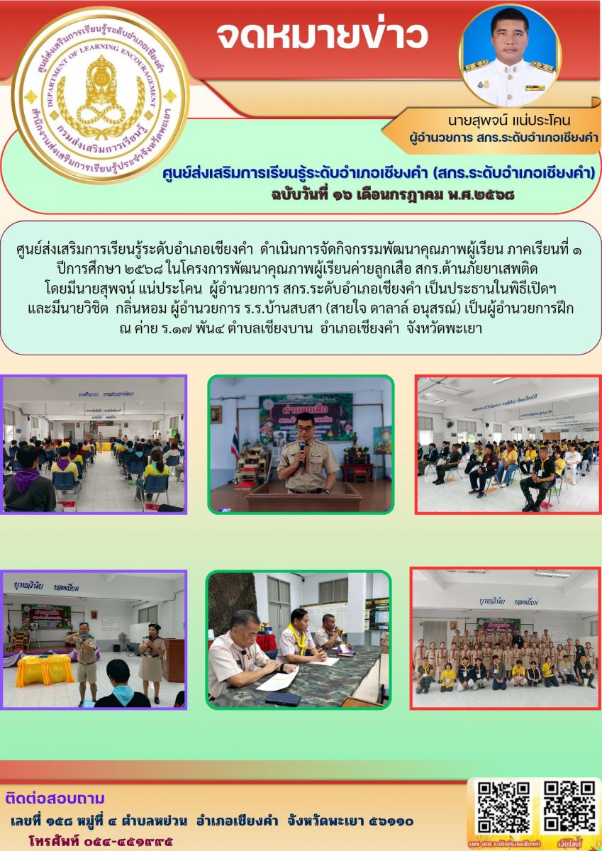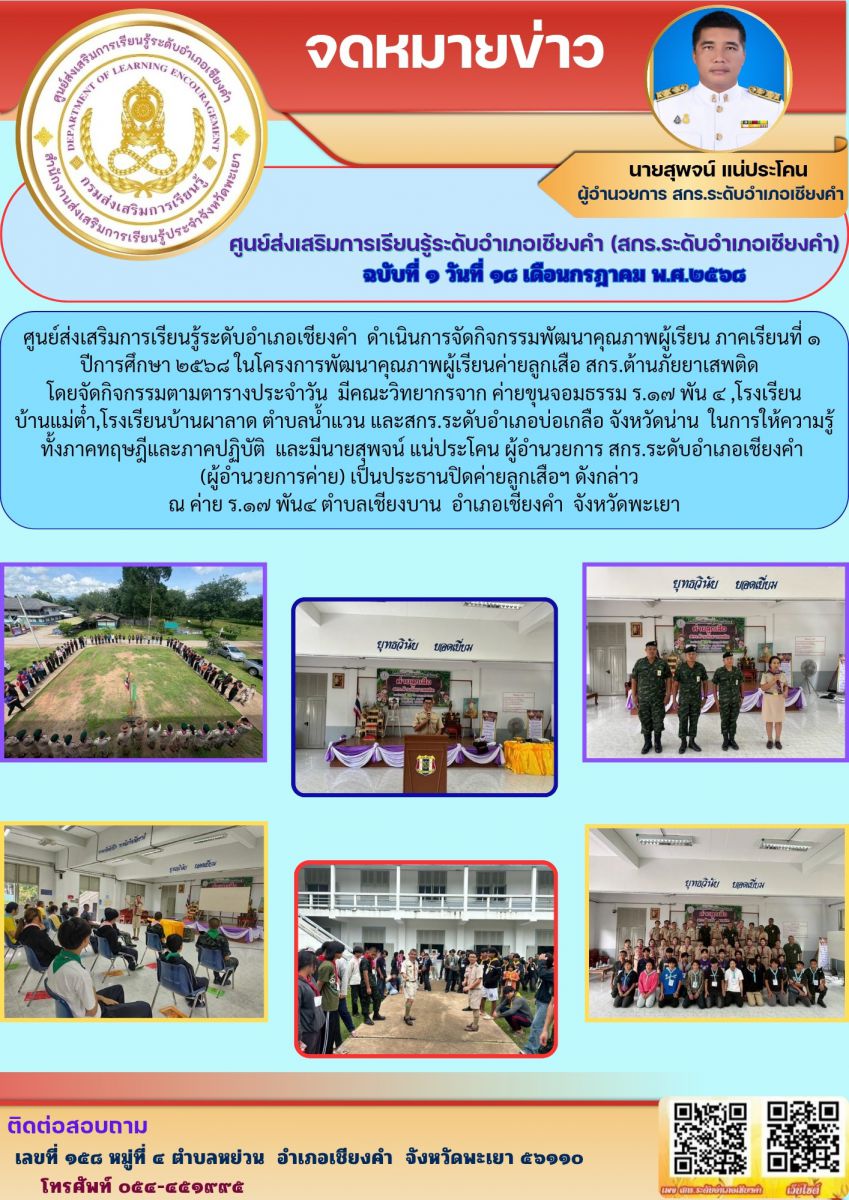 ร่วมดำเนินการจัดกิจกรรมพัฒนาคุณภาพผู้เรียน ภาคเรียนที่ ๑ ปีการศึกษา ๒๕๖๘ ในโครงการพัฒนาคุณภาพผู้เรียนค่ายลูกเสือ สกร.ต้านภัยยาเสพติด...