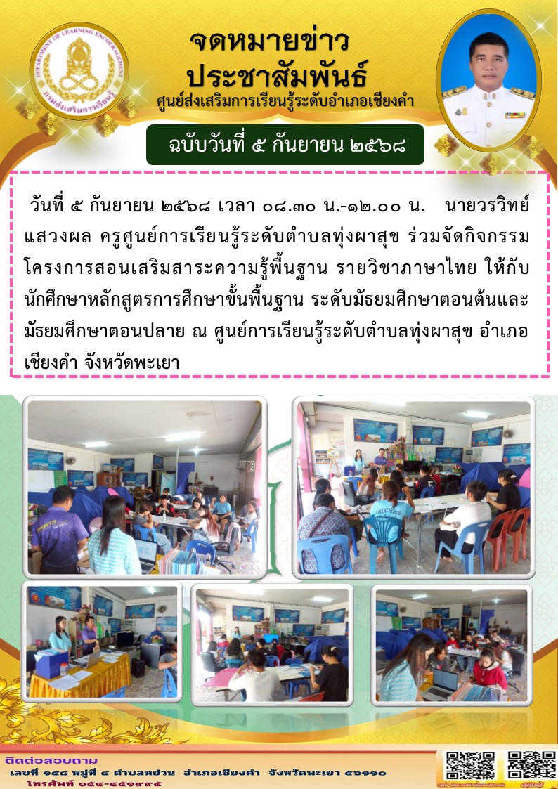 วันที่ 5 กันยายน 2568 เวลา 08.30 น.-12.00 น. นายวรวิทย์ แสวงผล ครูกศน.ตำบลทุ่งผาสุข ร่วมจัดกิจกรรมโครงการสอนเสริมสาระความรู้พื้นฐาน รายวิชาภาษาไทย ให้...