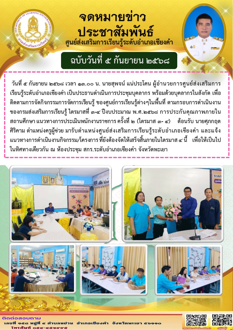 วันที่ 5 กันยายน 2568 เวลา 13.00 น. นายสุพจน์ แน่ประโคน ผู้อำนวยการศูนย์ส่งเสริมการเรียนรู้ระดับอำเภอเชียงคำ เป็นประธานดำเนินการประชุมบุคลากรพร้อมด้วย...