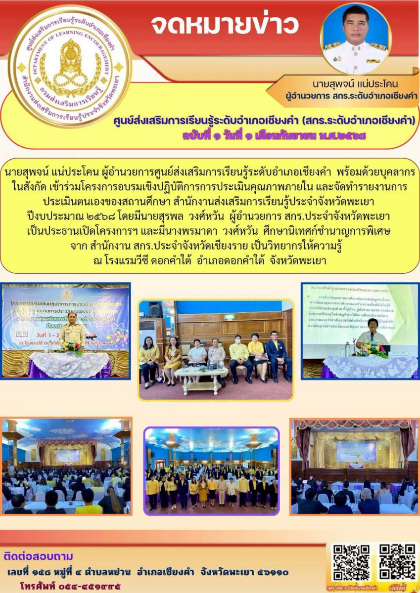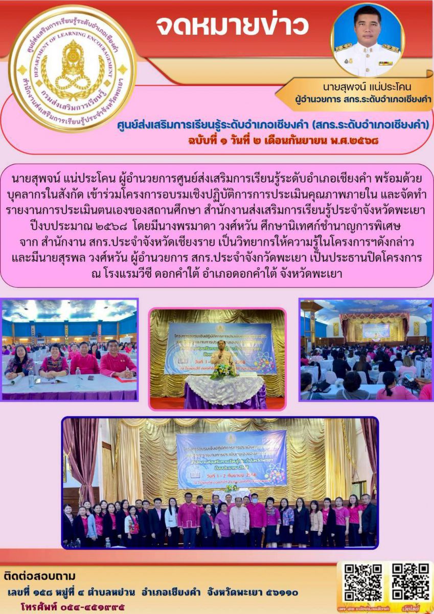 วันที่ ๒ กันยายน ๒๕๖๘ นายสุพจน์ แน่ประโคน ผู้อำนวยการศูนย์ส่งเสริมการเรียนรู้ระดับอำเภอเชียงคำ พร้อมด้วยบุคลากรในสังกัด เข้าร่วมการอบรมเป็นวันที่๒ ในโ...