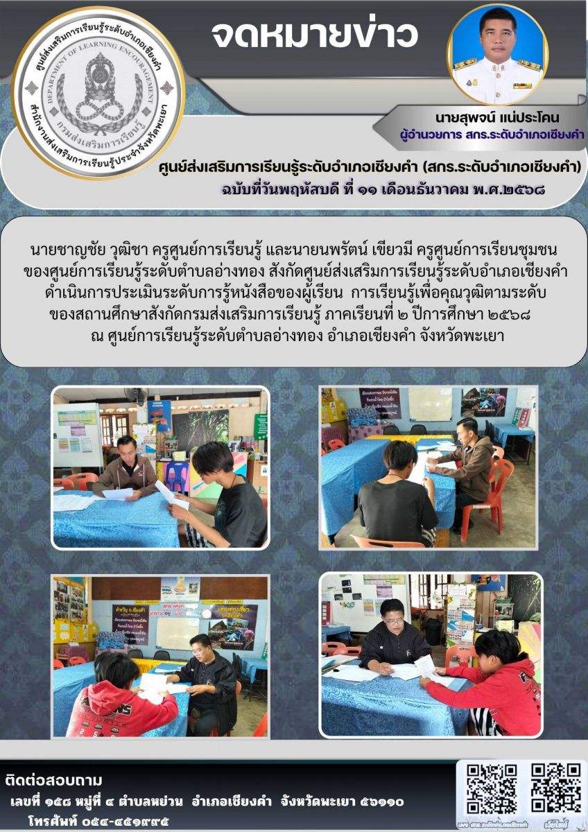 บุคลากรศูนย์การเรียนรู้ระดับตำบลอ่างทอง(ศกร.) ประเมินระดับการรู้หนังสือของผู้เรียน การเรียนรู้เพื่อคุณวุฒิตามระดับของสถานศึกษา...